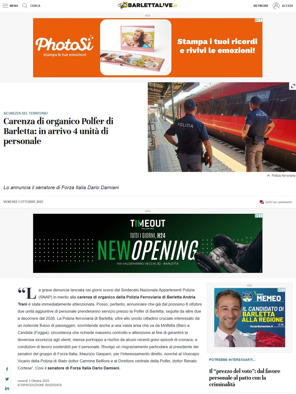 la grave denuncia lanciata nei giorni scorsi dal Sindacato Nazionale Appartenenti Polizia (SNAP) in merito alla carenza di organico della Polizia Ferroviaria di Barletta Andria Trani è stata immediatamente attenzionata. Posso, pertanto, annunciare che già dal prossimo 6 ottobre due unità aggiuntive di personale prenderanno servizio presso la Polfer di Barletta, seguite da altre due a decorrere dal 2026.