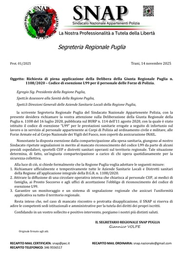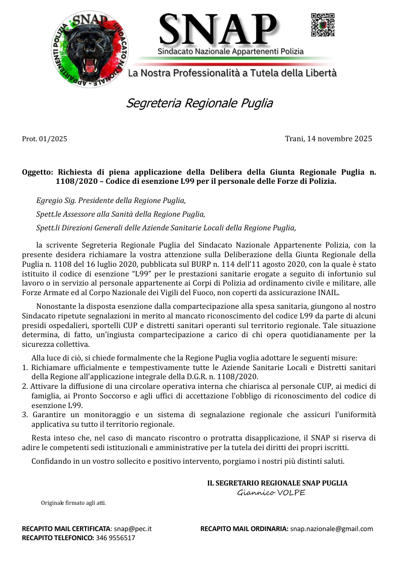 Richiesta di piena applicazione della Delibera della Giunta Regionale Puglia n. 1108/2020 – Codice di esenzione L99 per il personale delle Forze di Polizia.
