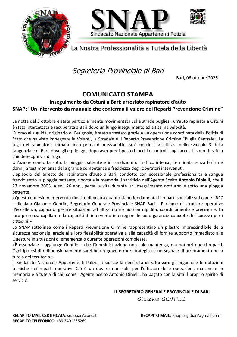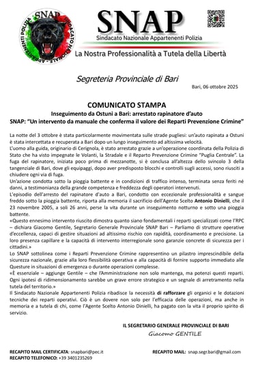 INSEGUIMENTO DA OSTUNI A BARI: ARRESTATO RAPINATORE D'AUTO. SNAP: "UN INTERVENTO DA MANUALE CHE CONFERMA IL VALORE DEI REPARTI PREVENZIONE CRIMINE