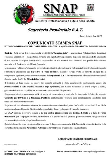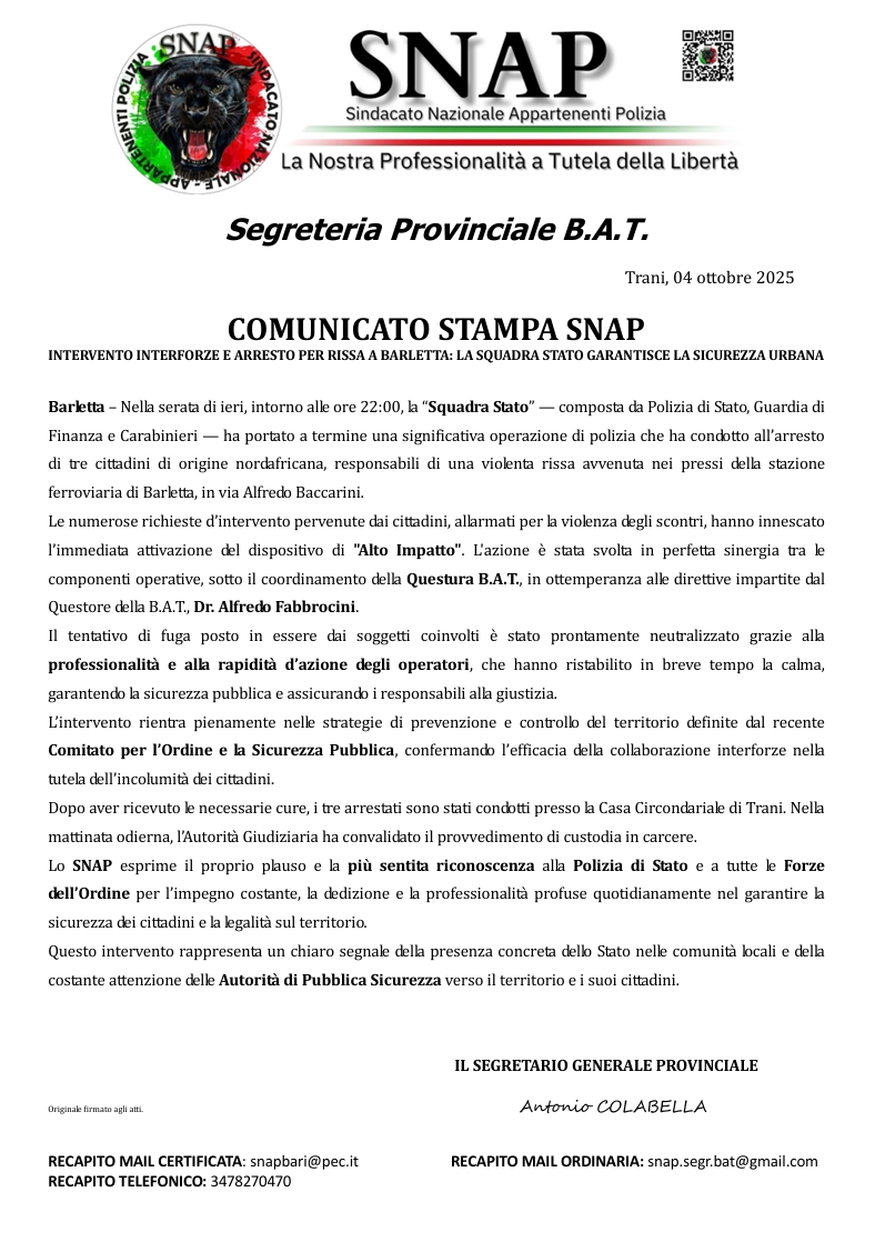 Barletta – Nella serata di ieri, intorno alle ore 22:00, la “Squadra Stato” — composta da Polizia di Stato, Guardia di Finanza e Carabinieri — ha portato a termine una significativa operazione di polizia che ha condotto all’arresto di tre cittadini di origine nordafricana, responsabili di una violenta rissa avvenuta nei pressi della stazione ferroviaria di Barletta, in via Alfredo Baccarini.
