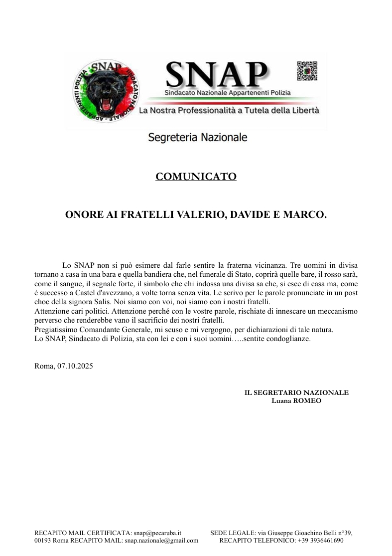 Lo SNAP non si può esimere dal farle sentire la fraterna vicinanza. Tre uomini in divisa tornano a casa in una bara e quella bandiera che, nel funerale di Stato, coprirà quelle bare, il rosso sarà, come il sangue, il segnale forte, il simbolo che chi indossa una divisa sa che, si esce di casa ma, come è successo a Castel d'avezzano, a volte torna senza vita.