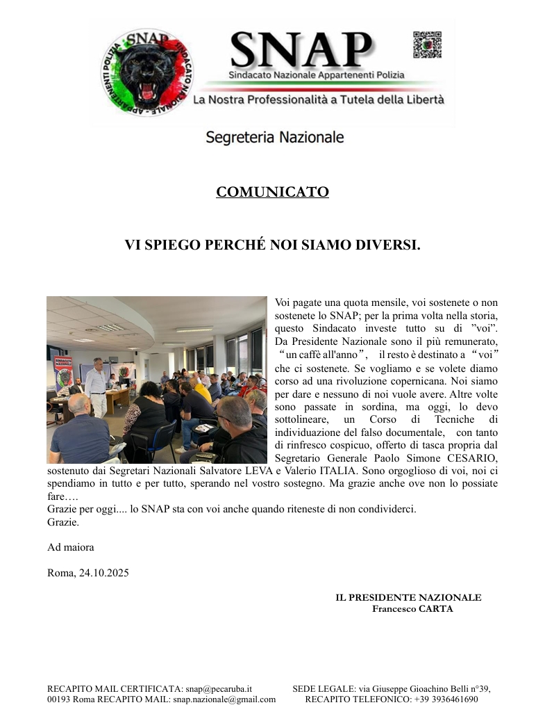 Voi pagate una quota mensile, voi sostenete o non sostenete lo SNAP; per la prima volta nella storia, questo Sindacato investe tutto su di ”voi”. Da Presidente Nazionale sono il più remunerato, “un caffè all'anno”, il resto è destinato a “voi” che ci sostenete.