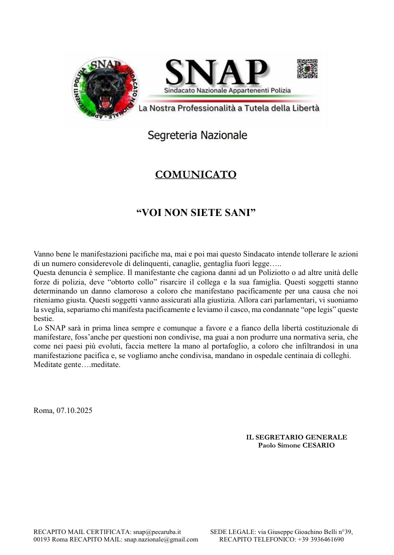 Vanno bene le manifestazioni pacifiche ma, mai e poi mai questo Sindacato intende tollerare le azioni di un numero considerevole di delinquenti, canaglie, gentaglia fuori legge….. Questa denuncia è semplice. Il manifestante che cagiona danni ad un Poliziotto o ad altre unità delle forze di polizia, deve “obtorto collo” risarcire il collega e la sua famiglia.